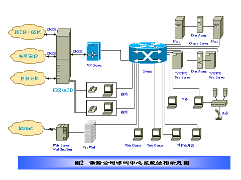某保險(xiǎn)公司電話中心采取全國(guó)集中服務(wù)方式,其結(jié)構(gòu)如圖2所示,在電話呼叫中心集中管理所有人工語(yǔ)音坐席和電話中心運(yùn)行所需的所有業(yè)務(wù)數(shù)據(jù)、語(yǔ)音文件和硬件設(shè)備,服務(wù)全國(guó)。我們?cè)O(shè)計(jì)的方案具有如下特點(diǎn):