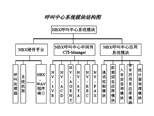 。。此呼叫中心系統(tǒng)主要由三大部分組成:美國3COM公司的NBX產(chǎn)品為系統(tǒng)平臺,及其配套的中間件產(chǎn)品CTI-Manager和上層第三方訂制的教育行業(yè)應用軟件。根據(jù)需求,應用軟件由五個功能模塊組成:通訊控制模塊、前期招生應用模塊、入學后咨詢應用模塊、非學歷項目應用模塊、統(tǒng)計查詢模塊。系統(tǒng)模塊結(jié)構(gòu)圖如下: