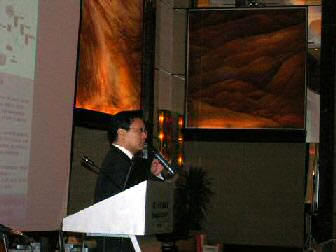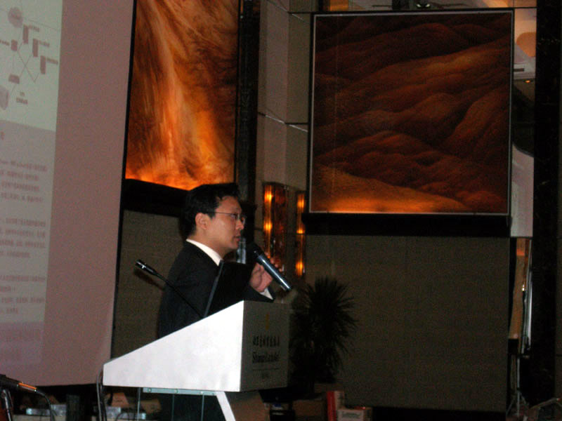 。。2005年8月24日,3Com NBX語音通訊產品推廣會于北京香格里拉大酒店成功舉辦。圖為3Com中國地區(qū)高級市場經理朱海翔闡述3Com產品與市場(點擊察看大圖)