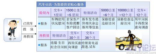 根據(jù)詳細的客戶或交易信息(如生日、性別、愛好、購車記錄、投保記錄等)主動與客戶通過電話、短信等方式,進行客戶回訪、投保到期再保提醒、生日祝福、節(jié)日問候、再保后的關(guān)懷等服務,與客戶建立良好的長期關(guān)系。