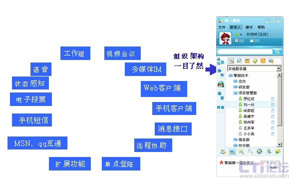 UcSTAR:Unified Communication Star,是擎旗技術(shù)研發(fā)的統(tǒng)一通訊平臺,它為企業(yè)提供多種通訊手段(包括即時(shí)通信、視頻、語音、郵件、短信、MSN/QQ互通等);并可融合企業(yè)的各種應(yīng)用系統(tǒng)(OA、ERP、CRM、網(wǎng)站、電子商務(wù)系統(tǒng)等);將企業(yè)對外溝通、銷售和服務(wù)、對內(nèi)溝通和協(xié)作無縫整合;輕松實(shí)現(xiàn)無地域/時(shí)間限制的,可管理、可控制、可擴(kuò)展的,集團(tuán)外部溝通、服務(wù)和銷售一體化的統(tǒng)一工作平臺。此外,它也可被分離應(yīng)用為企業(yè)IM及實(shí)時(shí)協(xié)作系統(tǒng)、多媒體呼叫中心系統(tǒng)、專業(yè)級的IP視頻會議系統(tǒng)等。