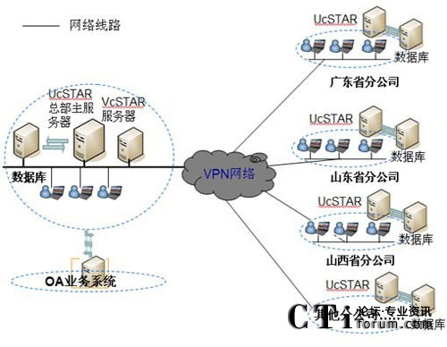 在公司總部部署主UcSTAR服務器,全國省級分公司分別部署一套子UcSTAR服務器,組成星型結(jié)構公司內(nèi)部的溝通與協(xié)作系統(tǒng)。