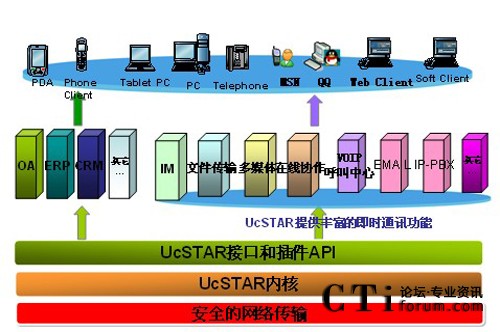 如圖所示,UcSTAR集成多種通信及協(xié)作手段,跟OA、ERP等應(yīng)用管理系統(tǒng)通過(guò)接口很容易實(shí)現(xiàn)融合。UcSTAR通過(guò)提供三種客戶端:桌面客戶端、Web客戶端及基于J2ME的手機(jī)客戶端而實(shí)現(xiàn)多種終端的接入。此外,跟QQ/MSN等第三方IM系統(tǒng)也能實(shí)現(xiàn)互聯(lián)互通,并可控制和管理這些互通功能和信息。