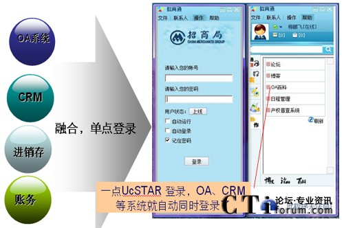 UcSTAR支持與業(yè)務(wù)系統(tǒng)的雙向單點(diǎn)登錄,在業(yè)務(wù)系統(tǒng)中可迅速點(diǎn)擊啟動(dòng)UcSTAR,并自動(dòng)登錄,無(wú)需輸入賬號(hào)密碼。