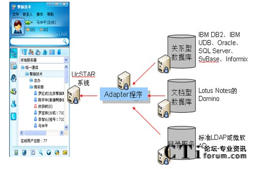 UcSTAR可為客戶定制各類Adapter程序,將OA、ERP等應(yīng)用系統(tǒng)中的數(shù)據(jù)庫(kù)同步共享過(guò)來(lái),實(shí)現(xiàn)組織架構(gòu)同步等功能。