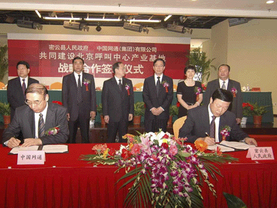 簽約儀式在密云瑞海姆田園度假村舉行,雙方就共建北京呼叫中心產(chǎn)業(yè)基地項目簽訂了《共同建設北京呼叫中心產(chǎn)業(yè)基地戰(zhàn)略合作協(xié)議》,北京市副市長茍仲文同志、中國網(wǎng)通(集團)有限公司董事長兼總裁左迅生、副總裁姜正新,北京市發(fā)展改革委、規(guī)劃委等市政府相關(guān)部門、密云縣人民政府、中國網(wǎng)通(集團)有限公司以及多家新聞媒體共計100余人參加了儀式。