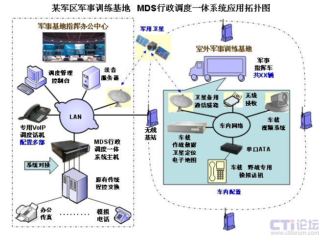 為了加強現(xiàn)代化軍隊的建設,某軍區(qū)在其軍分區(qū)的指揮訓練基地,使用先進的技術,搭建了一套由幾十輛軍事指揮車組成的作戰(zhàn)指揮訓練系統(tǒng),其中的語音通信指揮系統(tǒng)部分,采用了美國Zed-3公司最先進的基于IP技術的MDS80行政調(diào)度一體化通信系統(tǒng),解決了訓練基地的指揮中心大樓的原有通信系統(tǒng),與室外的訓練基地各輛指揮車之間,通過基地無線網(wǎng)絡及衛(wèi)星備份鏈路提供的IP通道,實現(xiàn)語音的指揮調(diào)度通信,達到訓練基地要求的最佳的語音指揮調(diào)度通信效果。