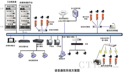 整體解決方案由軟交換服務(wù)器、會(huì)議服務(wù)器、錄音服務(wù)器、數(shù)字中繼網(wǎng)關(guān)、調(diào)度臺(tái)、有線(xiàn)對(duì)講模塊、有線(xiàn)廣播模塊、無(wú)線(xiàn)對(duì)講模塊等幾部分組成,系統(tǒng)基于IP網(wǎng)絡(luò)部署,所有設(shè)備均直接接入到IP網(wǎng)絡(luò)上,通過(guò)IP網(wǎng)絡(luò)匯聚到指揮中心進(jìn)行交換和統(tǒng)一管理調(diào)度。