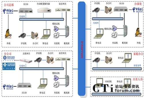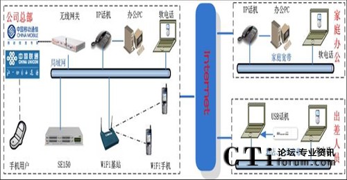 此方案適用于具有“移動辦公、頻繁出差、家庭辦公”需求的企業(yè)。系統(tǒng)要求企業(yè)內部部署好數(shù)據(jù)網(wǎng)絡,如果采用模擬終端,則企業(yè)的各個辦公點需要先將網(wǎng)絡線路和電話線路部署到位。如果需要應用WIFI終端,則需要部署WIFI網(wǎng)絡。