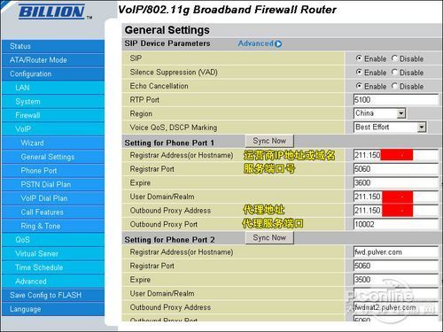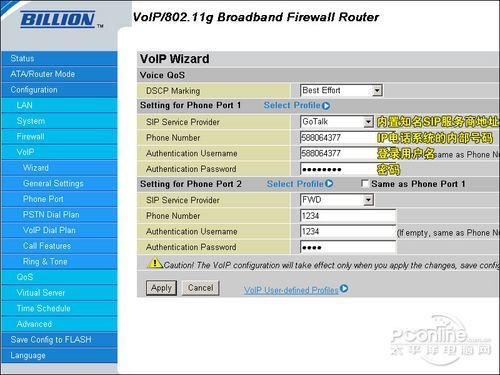 把申請得到的相關(guān)數(shù)據(jù)填入BiPAC 6404VGP中,在路由器后面接上電話就可以享受完全免費(fèi)或超低價(jià)格的電話服務(wù)了。同一個(gè)SIP服務(wù)器下面的用戶互相撥打電話、收發(fā)傳真是免費(fèi)的。