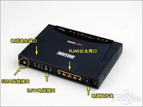BiPAC 6404VGP后面接口板除了和普通無線路由器一樣有1個(gè)WAN接口,4個(gè)LAN接口外,還多出了三個(gè)RJ11的電話接口,這個(gè)就是用來連接傳真機(jī)或電話機(jī)的。此外,考慮到BiPAC 6404VGP的無線功能在企業(yè)中應(yīng)用需要有較大的信號覆蓋范圍,所以它還提供了一個(gè)SMA天線接口可用來連接高增益天線。