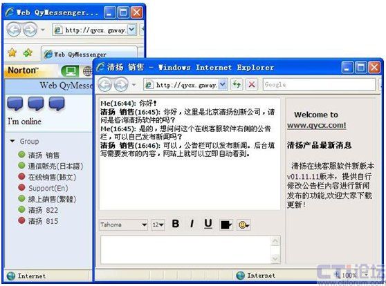 Web即時(shí)通信,對(duì)任意地方的客戶(hù),是用IE即可以訪(fǎng)問(wèn)"對(duì)話(huà)"。所以,它虛擬出一個(gè)銷(xiāo)售人員的接觸途徑。