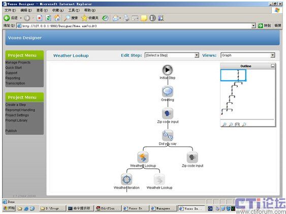 Home,在打開的Voxeo Prophecy網(wǎng)頁中點擊Prophecy Designer即開始了我們創(chuàng)建VoiceXML項目的輕松之旅。該設(shè)計工具將整個VoiceXML應(yīng)用以圖表或樹狀結(jié)構(gòu)直觀地呈現(xiàn)給開發(fā)者,可以方便地控制和修改其交互流程,如圖3所示。