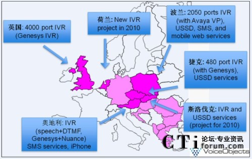 VoiceObjects在T-Mobile的應(yīng)用橫跨歐洲幾個國家,VoiceObjects在T-Mobile主要的挑戰(zhàn)來自三方面。第一,T-Mobile在歐洲幾個國家的自服務(wù)渠道多元化,短信、USSD、Mobile
