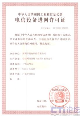 CTI論壇(ctiforum)05月15日消息: 日前從深圳市震有科技有限公司傳出消息,公司自主研發(fā)的NuBiz NC5200 IP電話網(wǎng)關(guān)設(shè)備順利通過工業(yè)和信息化部電信設(shè)備認(rèn)證中心的審核,取得“電信設(shè)備進網(wǎng)許可證”。此舉標(biāo)志著震有科技的NuBiz交換產(chǎn)品已成功取得進入國家電信網(wǎng)的資質(zhì),為大規(guī)模電信級推廣應(yīng)用打下了基礎(chǔ)。