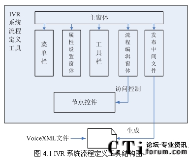 從圖4.4所示結(jié)構(gòu)中,通過主窗體可以訪問其它窗體操作,同時控制窗體與類模塊的信息交互。系統(tǒng)中的各個窗口的實現(xiàn)均是基于基礎類包的。下面詳細介紹IVR系統(tǒng)流程工具各個部分的實現(xiàn)。其實現(xiàn)工具的內(nèi)容詳見文獻[31]。