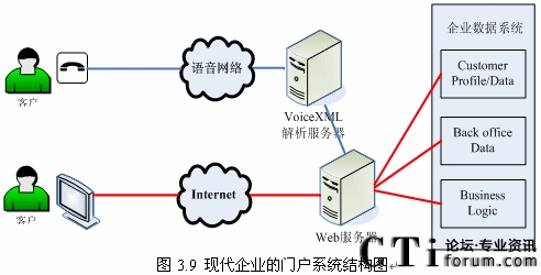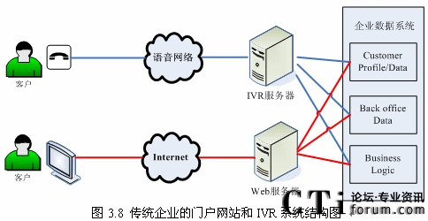 隨著Internet和Web技術(shù)的迅速發(fā)展,越來的企業(yè)開始建立自己的門戶網(wǎng)站,同時又擁有自己的IVR系統(tǒng)(如圖3.8所示),但是兩套系統(tǒng)完全獨立,語音系統(tǒng)和數(shù)據(jù)系統(tǒng)沒有任何交互或者只有很少的交互。而建立IVR系統(tǒng)的目標(biāo)就是給客戶更好的體驗,使客戶能方便的通過電話完成更多以前需要登陸企業(yè)門戶網(wǎng)站,或者親自去企業(yè)或其網(wǎng)點去辦理的業(yè)務(wù),這就需要IVR系統(tǒng)能跟后臺數(shù)據(jù)系統(tǒng)有更多更好的交互!罢Z音門戶”的概念出現(xiàn)也愈發(fā)的證明這一點。
