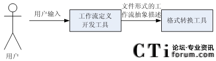 IVR系統(tǒng)的過程定義工具是一個可視化的軟件工具,它主要用于定義工作流模型中各個活動之間的關(guān)系[22]。工作流程過程定義向用戶提供對實際業(yè)務(wù)處理過程分析、建模的手段。其輸入輸出可以用圖3.2表達: