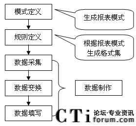 數(shù)據(jù)制作是報表生成過程的最后一個步驟,它在模式定義的基礎(chǔ)上,使用規(guī)則定義生成的映射規(guī)則集合將業(yè)務(wù)數(shù)據(jù)映射到報表中。根據(jù)數(shù)據(jù)規(guī)則的內(nèi)容,數(shù)據(jù)制作過程具體可以分為三個步驟,數(shù)據(jù)采集,數(shù)據(jù)變換,數(shù)據(jù)填寫。