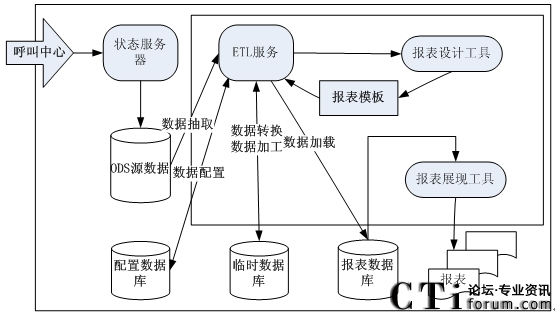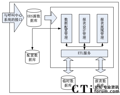 以上架構(gòu)圖中的呼叫中心是指呼叫中心系統(tǒng)的基礎(chǔ)話務(wù)功能部件,它是整個報表系統(tǒng)的基礎(chǔ),為其提供最初的數(shù)據(jù)來源,包括其基礎(chǔ)部件的通訊等。