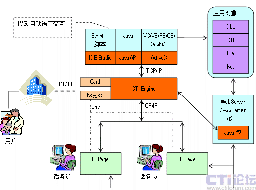 IVR部分,編寫Script++腳本程序或VC/VB/Delphi/PB/Java應(yīng)用程序控制電路的接續(xù)以及放音、錄音收碼、轉(zhuǎn)移等。
