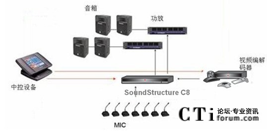 根據(jù)用戶的需求,結(jié)合用戶會議室現(xiàn)有的設(shè)備,我們選用寶利通具有獨特聲音處理技術(shù)的音頻處理平臺——SoundStructureC8。SoundStructureC8連接本地麥克風(fēng)和功放系統(tǒng),通過反饋聲抑制的功能來消除本地擴聲導(dǎo)致的嘯叫,保證會議室的聲音效果。C8聲音處理系統(tǒng)還可以和視頻會議以及電話會議一起使用,解決遠程會議的回聲和噪聲問題,改善會議質(zhì)量,提高會議效率。
