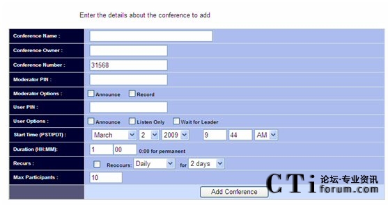 設(shè)定會議基本信息后,點(diǎn)擊下面的Add Conference button,頁面如下: