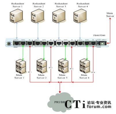 正常通信時(shí),BRI\PRI線路信號(hào)流向主服務(wù)器,進(jìn)行正常語音通信(BRI\PRI-OUT2),當(dāng)主服務(wù)器發(fā)生意外斷電,不能正常使用時(shí),BRI\PRI線路信號(hào)流向備份服務(wù)器(BRI\PRI-OUT1),保證正常通信。具體連接示意如下圖所示: