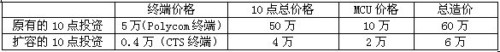 以下列出了原有使用polycom終端的1級會議系統(tǒng)和采用CTS方案擴(kuò)容的2,3級會議系統(tǒng)投資比較。