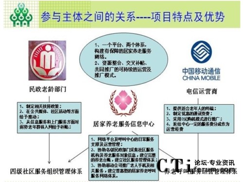 項(xiàng)目運(yùn)作思路,以專業(yè)的運(yùn)營機(jī)構(gòu)(民辦非企業(yè))作為項(xiàng)目支撐點(diǎn),將政府推動居家養(yǎng)老服務(wù)體系建設(shè)的需求和電信運(yùn)營商要擴(kuò)大和穩(wěn)定用戶群的需求向結(jié)合,共同建設(shè)和推動居家養(yǎng)老呼叫服務(wù)網(wǎng)絡(luò)體系的建設(shè)。