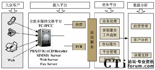 杭州全勝通訊有限公司自主研發(fā)的全勝多媒體IP呼叫中心平臺(TC-IPCC),是基于交換機(jī)級別的純IPCC平臺。該平臺集CTI、IVR、FAX、SMS、Email、錄音監(jiān)控、電話會議、統(tǒng)一智能路由、呼出管理等功能于一體,可用于構(gòu)建各類聯(lián)絡(luò)中心、自動語音系統(tǒng)、熱線電話、會議電話、電話銷售等系統(tǒng),輕松滿足各行業(yè)客戶、合作伙伴個性化建設(shè)需求。