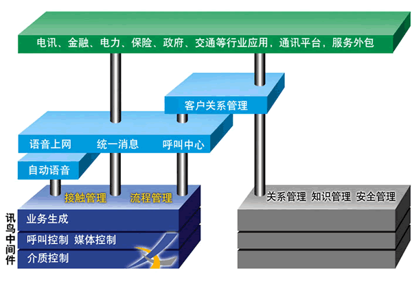 而要支撐這些復(fù)雜的應(yīng)用,中間件應(yīng)該可以進(jìn)行接觸管理、流程管理。和目前已有的關(guān)系管理、知識管理、安全管理結(jié)合,可以全方位的支撐應(yīng)用系統(tǒng)。訊鳥中間件就是這樣的中間件,它是建立在分布式計算環(huán)境上,可以控制多種通訊設(shè)備,支撐生成多種業(yè)務(wù)應(yīng)用軟件的軟件。它可以支持語音網(wǎng)的交互,因特網(wǎng)的交互,支持呼叫和數(shù)據(jù)的同步傳輸。它支持工作流程的生成,而不用了解一個工作流程是如何在不同的設(shè)備上運行。同時,它的業(yè)務(wù)描述語言是用中文和圖標(biāo)表達(dá),易于和業(yè)務(wù)接軌,方便系統(tǒng)集成商、最終客戶,給系統(tǒng)分析員提供優(yōu)秀的設(shè)計工具和運行平臺,極大提高了工程的實施效率。