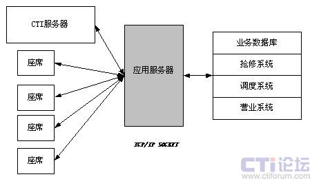 Ο數(shù)據接口采用三層C/S結構,通過構建功能強大的應用服務器,把呼叫中心的數(shù)據流與燃氣公司客戶系統(tǒng)、營業(yè)系統(tǒng)、搶修系統(tǒng)和燃氣調度系統(tǒng)結合起來,充分利用了已有系統(tǒng)標準的數(shù)據接口,實現(xiàn)對后臺數(shù)據庫的訪問。如圖: