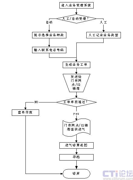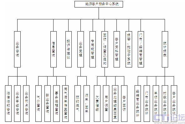 其中,主要功能劃分為:業(yè)務咨詢、信息查詢、投訴與建議、業(yè)務受理、專用瓶管理、回訪/調查/通知、報警/搶險、門市/經銷商管理、客戶信息管理以及統(tǒng)計報表等功能。
