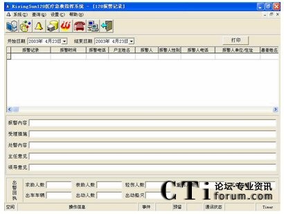 指揮中心信息查詢系統(tǒng)基于客戶/服務(wù)器方式。支持全中文檢索及模糊查詢、組合條件查詢、記錄瀏覽查詢、綜合查詢、提供指揮中心與信息中心間數(shù)據(jù)的雙向數(shù)據(jù)流動等功能。還可對120相關(guān)信息進(jìn)行錄入、分類、保存、歸檔、管理維護(hù),并提供檢索及查詢、綜合匯總、報表生成、統(tǒng)計(jì)打印及發(fā)送給領(lǐng)導(dǎo)審閱等功能,并可跟蹤值機(jī)人員對120報警的受理急救、指揮的每一步驟的處理情況。