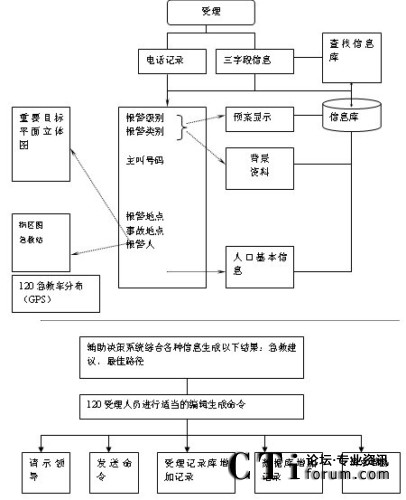 受理臺根據(jù)報警類別和報警地點(diǎn)等信息,判別是否是重點(diǎn)單位、重大事故等,如是則自動查找相關(guān)的數(shù)據(jù)庫,調(diào)出預(yù)存的急救方案,最后由120指揮長作出決策。