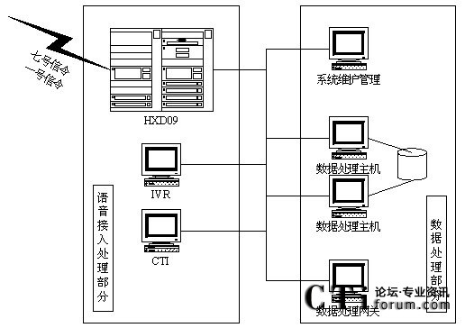 語音接入處理部分主要完成用戶的語音話路接入功能。其中:HXD09語音交換機(jī)可以支持七號信令和一號信令的數(shù)字E1線路的接入。HXD09的IVR完成自動業(yè)務(wù)受理功能,實(shí)現(xiàn)系統(tǒng)7*24小時不間斷服務(wù)。CTI完成對排隊(duì)機(jī)的監(jiān)視、控制任務(wù),并能夠?qū)崟r的提供每個語音通道的信息配合IVR完成自動繳費(fèi)業(yè)務(wù)的實(shí)現(xiàn)。