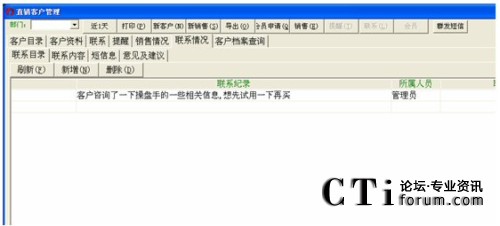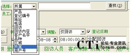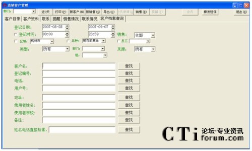 注:對于登記日期一直到客戶名這一段條件的查詢(即上圖中所有的那些查詢條件),都得點擊客戶名欄對應的那個查找按鈕才能進行有效的查找,否則若點擊其它按鈕(姓名電話直接檢索對應的查找除外),都會提示“請輸入****”這種錯誤信息。而點擊最后一個查找,也是無效的,會轉到客戶管理中空白信息欄(即什么也查不到)。