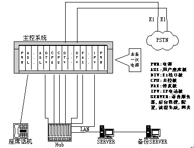 1、 基于數(shù)字程控交換技術(shù),主控系統(tǒng)通過LAN與SERVER交互語音與傳真數(shù)據(jù);