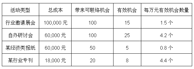 從前面的分析中,我們曾經(jīng)談到過:市場的核心是用最低的成本,幫助企業(yè)把目標(biāo)客戶推動成為機(jī)會客戶。那么,同樣成本推動為有效機(jī)會客戶數(shù)量的多少,則是評價市場方案的有效模型。當(dāng)然,針對個人消費(fèi)市場,似乎可以用更加簡單的投入產(chǎn)出比進(jìn)行分析,一種類型的市場投放運(yùn)作,在一定時間內(nèi)帶來的業(yè)績收益與成本的比較,可以方便地了解到不同類型市場投放的效益對比;而對于大部分需要有銷售過程的機(jī)構(gòu)消費(fèi)客戶,我們可以參考以下我們對劉總公司拿出的模型示例: