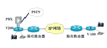 方案說明:以快速以太網(wǎng)口接入數(shù)據(jù)網(wǎng)絡(luò),V200-2FXO接本地PBX或直接連入PSTN,V200-2FXS直接提供兩路話音接入。