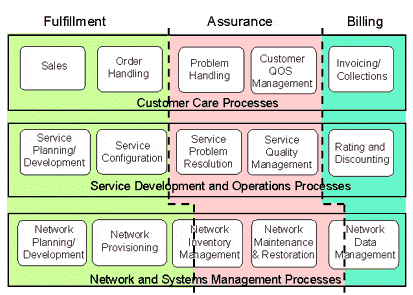 在TMF的模型中,從功能上來看,OSS主要包括三大功能:業(yè)務(wù)開通(Service Fulfillment);業(yè)務(wù)保障(Service Assurance);計(jì)費(fèi),又稱業(yè)務(wù)計(jì)量(Service