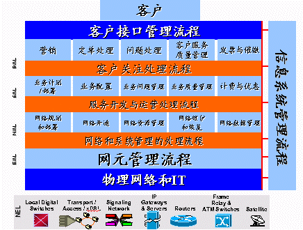 Assurance)的定義是,提供量化的測量指標(biāo),確保網(wǎng)絡(luò)服務(wù)能夠達(dá)到客戶所訂購的要求。(Service Usage)的定義是,測量電信網(wǎng)絡(luò)中各種業(yè)務(wù)的使用情況,計(jì)算處理使用電信業(yè)務(wù)的應(yīng)收費(fèi)用,并對(duì)電信業(yè)務(wù)的收費(fèi)過程提供支持。這是從縱向的角度來看,而從橫向的角度來看,從電信管理的角度來看,OSS主要處在三個(gè)管理層面:客戶服務(wù)層;業(yè)務(wù)管理層;網(wǎng)絡(luò)管理層。