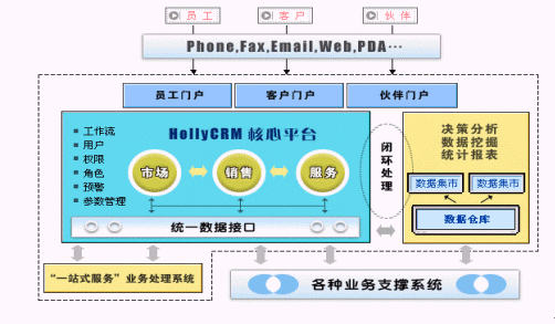 HollyCRM通過(guò)EAI與企業(yè)原有的業(yè)務(wù)系統(tǒng)充分整合,有效解決了阻礙企業(yè)內(nèi)部信息良性流轉(zhuǎn)的"信息孤島"現(xiàn)象。HollyCRM將分析型CRM產(chǎn)生的客戶價(jià)值和經(jīng)營(yíng)分析結(jié)果實(shí)時(shí)反饋到運(yùn)營(yíng)型CRM中,通過(guò)協(xié)作型CRM提供的接觸渠道,針對(duì)不同客戶提供個(gè)性化的營(yíng)銷、銷售和服務(wù)活動(dòng)。HollyCRM實(shí)現(xiàn)了整個(gè)企業(yè)信息的閉環(huán)、良性循環(huán)。