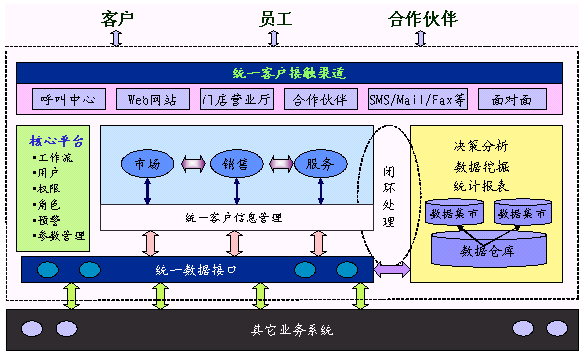 HOLLYCRM(合力金橋軟件公司)推出的HollyCRM是全面集成的客戶關(guān)系管理解決方案,覆蓋協(xié)作型CRM、運(yùn)營(yíng)型CRM和分析型CRM的全部范疇。HollyCRM通過(guò)telephone、Email、Fax、WAP、Web、PDA、Face to Face等各種各樣渠道與客戶互動(dòng),通過(guò)市場(chǎng)營(yíng)銷(Marketing)、銷售(Sales)和服務(wù)(Service)等業(yè)務(wù)流程的管理,將客戶的各種背景信息、偏好、行為習(xí)慣、交易數(shù)據(jù)、信用狀況等信息收集并整合在一起,再將這些運(yùn)營(yíng)數(shù)據(jù)和外來(lái)的市場(chǎng)數(shù)據(jù)經(jīng)過(guò)整合和變換,裝載進(jìn)數(shù)據(jù)倉(cāng)庫(kù)(Data Warehouse)后,運(yùn)用OLAP和數(shù)據(jù)挖掘(Data Mining)等技術(shù)來(lái)從數(shù)據(jù)中分析和提取相關(guān)規(guī)律、模型和趨勢(shì),把有關(guān)客戶信息和知識(shí)在整個(gè)企業(yè)內(nèi)得到有效的流轉(zhuǎn)和共享,并進(jìn)一步轉(zhuǎn)化為企業(yè)的戰(zhàn)略規(guī)劃和科學(xué)決策,用于提高在所有渠道上同客戶交互的有效性和針對(duì)性,把合適的產(chǎn)品和服務(wù),通過(guò)合適的渠道,在適當(dāng)?shù)臅r(shí)候,提供給適當(dāng)?shù)目蛻簦瑥亩鴮?shí)現(xiàn)利潤(rùn)的最大化。