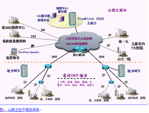 在山西省抗擊非典的關(guān)鍵時(shí)期,為了解決非典信息溝通不暢,資源整合不夠等問題,山西省衛(wèi)生廳緊急組建視頻會(huì)議網(wǎng)絡(luò),要求能夠容納非典防治指揮中心、省疾病會(huì)議控制中心、省一大、省兒童醫(yī)院、山大一院、山大二院及衛(wèi)生廳領(lǐng)導(dǎo)、省委領(lǐng)導(dǎo)辦公室等十幾個(gè)非典防治重要部門,從整個(gè)政務(wù)往來看,系統(tǒng)要求具有高度穩(wěn)定性、良好的音視頻效果以及方便易用。經(jīng)測(cè)試,采用華為技術(shù)有限公司的ViewPoint