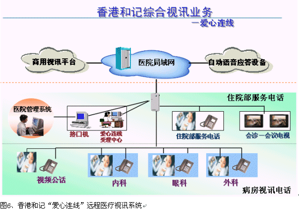目前,香港和記電信已經(jīng)在香港的"瑪麗醫(yī)院"大廳、非典病房、以及其他安全場(chǎng)所安裝了個(gè)人視頻系統(tǒng),通過該系統(tǒng),病人和家屬就可以進(jìn)行"面對(duì)面"的交流,無論對(duì)于非典病人的康復(fù),還是保護(hù)病人家屬,防止非典傳染都有及其重要的作用。