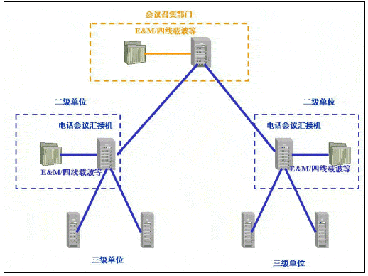當(dāng)前國內(nèi)許多行業(yè)由于行業(yè)的業(yè)務(wù)特點(diǎn),在原有的電話網(wǎng)應(yīng)用中,電話會(huì)議作為常用的交流手段發(fā)揮著重要作用。這些行業(yè)的電話會(huì)議業(yè)務(wù),主要是通過電話會(huì)議匯接機(jī)的方式實(shí)現(xiàn):會(huì)議召集單位通過電話會(huì)議匯接機(jī)(以下簡稱匯接機(jī))通過專線、撥號(hào)等方式連通下級(jí)單位(以下簡稱二級(jí)單位)的匯接機(jī),二級(jí)單位的匯接機(jī)通過專線、撥號(hào)等方式連通所轄單位(以下簡稱三級(jí)單位)的會(huì)場電話。這樣通過多級(jí)匯接機(jī)級(jí)連的方式實(shí)現(xiàn),主持單位和二、三級(jí)單位間的電話網(wǎng)連通,利用匯接機(jī)實(shí)現(xiàn)廣播、三方通話、調(diào)度發(fā)言單位等會(huì)議功能。