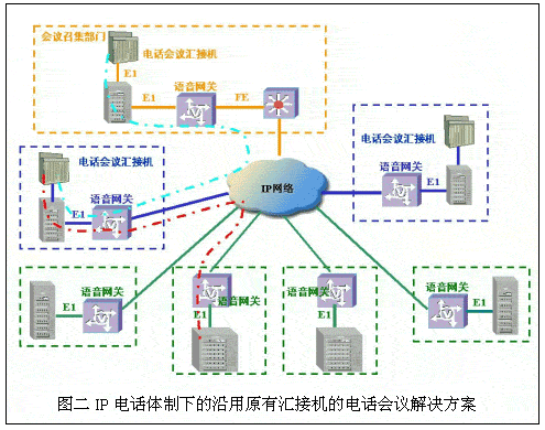 伴隨著IP網(wǎng)的建設(shè)和VoIP電話系統(tǒng)標(biāo)準(zhǔn)的日益完善,許多行業(yè)、部門開始在建設(shè)IP數(shù)據(jù)網(wǎng)的同時(shí),結(jié)合原有電話專網(wǎng)的改造,著手建設(shè)IP電話網(wǎng)絡(luò)。在IP電話網(wǎng)上實(shí)現(xiàn)原有的電話會(huì)議業(yè)務(wù)也就隨之提到日程上來。華為公司結(jié)合IP電話的特點(diǎn)和保護(hù)用戶已有投資的角度,提出延用電話會(huì)議匯接機(jī)和采用華為專用IP電話會(huì)議控制系統(tǒng)兩套解決方案: