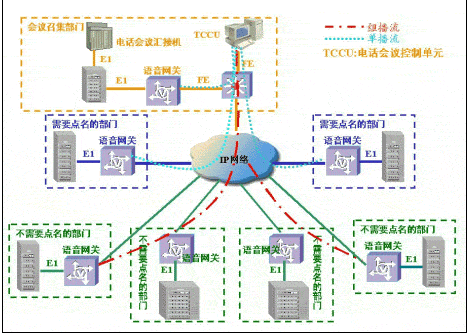采用原有的會(huì)議電話架構(gòu),只是話音的長途連接由模擬專線等改為IP傳輸。方案由于采用原有電話會(huì)議匯接機(jī),保護(hù)了用戶的原有投資。缺點(diǎn)是在召開多級(jí)會(huì)議電話時(shí),由于語音信號(hào)首先在召集單位語音網(wǎng)關(guān)進(jìn)行壓縮,經(jīng)IP傳輸后,在二級(jí)單位語音網(wǎng)關(guān)解壓縮還原為模擬話音,再經(jīng)二級(jí)單位的語音網(wǎng)關(guān)二次壓縮,經(jīng)IP網(wǎng)傳輸后,在三級(jí)單位的語音網(wǎng)關(guān)上二次解壓縮,導(dǎo)致語音信號(hào)多次壓縮/還原,對語音質(zhì)量損傷較大。